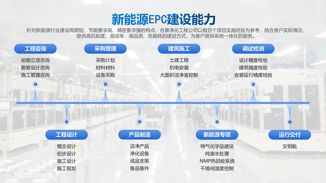 合景智慧建設是工業(yè)高端制造領(lǐng)域生產(chǎn)車間建設高潔凈度和低露點凈化車間內(nèi)裝工程的規(guī)劃、設計、采購、施工與服務一體化總承包商,多年來,在大型廠房建設方面積累了大量豐富的低凈化車間內(nèi)裝工程設計和施工經(jīng)驗,特別是在產(chǎn)能規(guī)劃、公用工程、環(huán)境工程(溫度、低露點、高潔凈度)等領(lǐng)域的制造、工藝流程、節(jié)能環(huán)保等提供完善的系統(tǒng)集成工程建設解決方案。